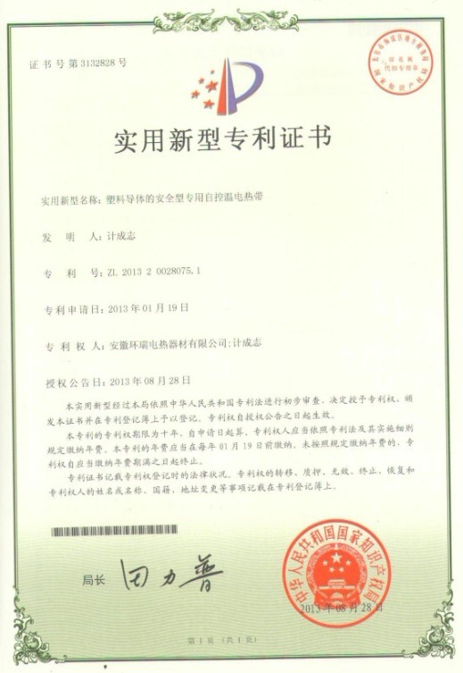 熱烈祝賀環(huán)瑞自控溫電伴熱獲得二項國家專利證書