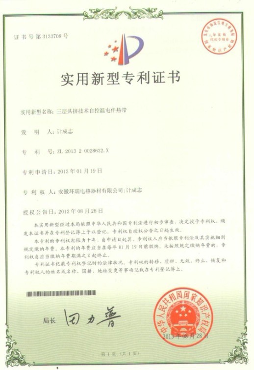 環(huán)瑞自成立研發(fā)小組至科學(xué)技術(shù)中心期間,通過獨立開發(fā),與合肥工業(yè)大學(xué)建立長期合作關(guān)系,聘請相關(guān)專業(yè)的技術(shù)專家等模式,投入大量的人力物力。我司以安全,實用性能為目標,對電伴熱帶結(jié)構(gòu)、原材料、生產(chǎn)工藝進行創(chuàng)新,最新研發(fā)的“三層共擠自控溫電伴熱帶”“ 塑料導(dǎo)體的安全型自控溫電熱帶”獲得了2項國家專利證書。我司已獲得了5項關(guān)于自限溫伴熱帶的國家專利證書,我司伴熱帶的生產(chǎn)技術(shù)已達到國內(nèi)先進。共計19項專利。新的專利證書已下達。