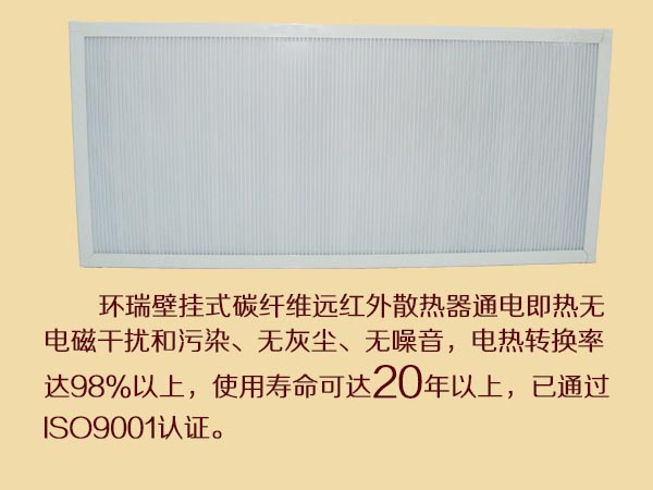 環(huán)瑞壁掛式碳纖維電暖器是采用先進(jìn)技術(shù)研制開發(fā)的一種新型電采暖的專利產(chǎn)品。采用高科技長絲碳纖維材料制成,具有性能穩(wěn)定,安全可靠,環(huán)保節(jié)電,經(jīng)濟(jì)實(shí)用等特點(diǎn)。屬于國家認(rèn)定的綠色環(huán)保電加熱產(chǎn)品。