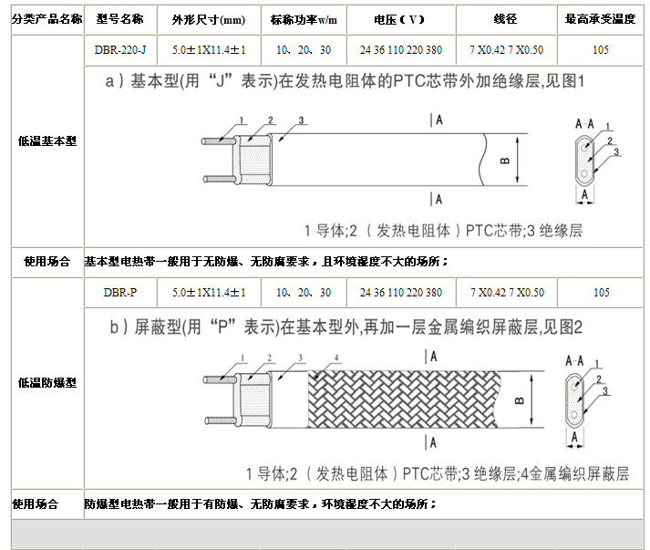 2.工業(yè)性電伴熱帶帶寬12mm-13.5mm ,具體參照上述結(jié)構(gòu)對照表