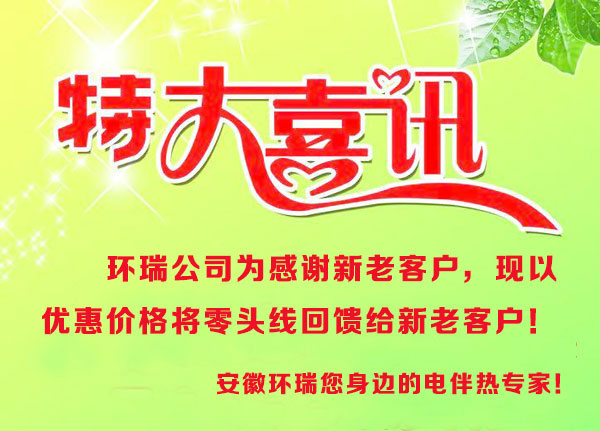 為感謝新老客戶對(duì)環(huán)瑞公司發(fā)展給予的支持,現(xiàn)有零頭線將以優(yōu)惠價(jià)回饋給新老客戶,歡迎廣大新老客戶咨詢訂購(gòu),環(huán)瑞十年專注電伴熱產(chǎn)品研發(fā),品質(zhì)保證。