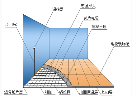 通過鋪設(shè)于地板上的地溫探頭或溫控器內(nèi)的室溫探頭,由房間溫控器控制溫度。當室內(nèi)溫度達到設(shè)定值后,溫控 器開始動作,斷開發(fā)熱電纜的電源,發(fā)熱電纜停止加熱,當室內(nèi)溫度低于溫控器設(shè)定值時,溫控器又開始啟動, 接通發(fā)熱電纜的電源,發(fā)熱電纜開始加熱,這樣往復(fù)運行。